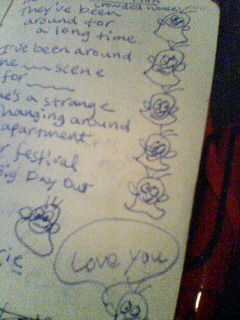 「この前さぁ酔っぱらってさ~自分の手帳にこんなにオバQ描いてんだよ~しょっぱいね~あたしってば」