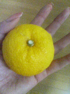 ゆずを手に持ち、