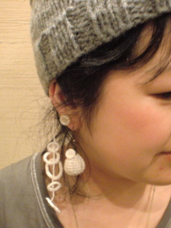 すずのピアス(耳・下部。前に書いたね、耳元でちりんちりん音がする)を作ってくれたニット作家さんの新作(かな?)が、耳・中ほどから、ぶらり。