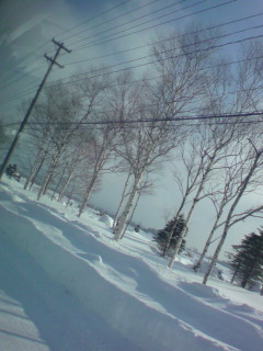 白樺と雪のコントラストが美しい並木を抜け、