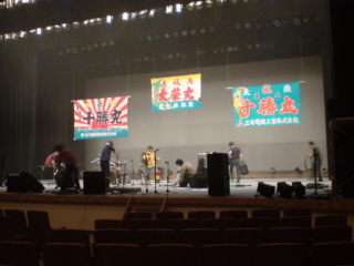 大漁旗を背に、歌ったり。アンコールでステージ上で荒巻鮭、一匹丸ごとプレゼントされたり(笑)。