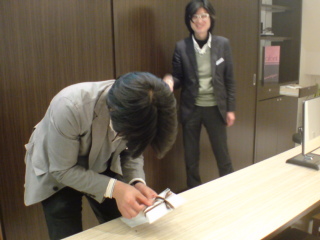 一生懸命ギフトラッピングするレアな(笑)館長の姿を激写(後ろは今月、登場してくださってるワタナベさんです。おしゃれ番長)☆‘気’がすごい伝わってくる…