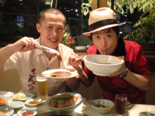 初めて盛岡冷麺を食べる・おごりの本人?上中ジョーヤさん(右)と、焼肉番長のドラム久保さん。