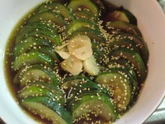 オリーブオイルをひいたところににんにくを入れ、ほどよく半月切りのズッキーニを焼く。お醤油と酢を(好きな分量で)混ぜたたれに、焼きたてのズッキーニを浸して味をつけて出来上がり!