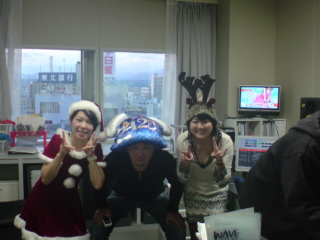 サンタのカッコで番組担当、新人アナウンサー・久保田ゆうこりん&ディレクター氏(真ん中・松本哲也さんとの月に一度の公開録音「Monthly Music Focus」を担当しているのも彼です)。
