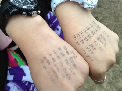 彼女たち、タイムテーブルをこうして手に書いてました。