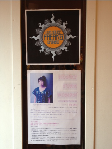 ライブハウスのドアに貼ってるフライヤー。照れるわ(汗)。 「チエちゃん、トークイベント、やらない?」…そんな、FREAKSチームの(たぶん)軽〜い誘いは、おおよそ1か月後に。ホントに実現された。