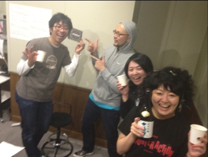 深夜とは思えない人の入れ替わりやにぎやかなスタジオ。FM岩手アナウンサー・阿部ちゃんは日本酒の差し入れつきでやってくるわ(みんなでカンパーイ!)、釜石支局・ブラフマン大好きチバくんは「本人来ない!」っつってんのにやって来るわ。そんなチバくんが‘T−チバ☆’と称してこの日のことを記したレポが面白い⇨コチラ♪