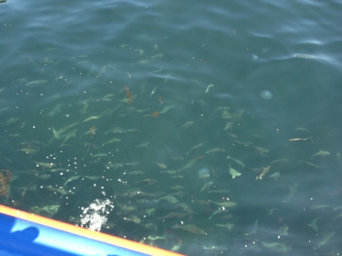 船の方に聞いたところでは、こうして魚がやってくるように‘仕込む’まで、4〜5年かかったということです。今では船のエンジン音で「エサが来る」と分かるらしく(笑)、魚が自然に寄ってくる、とのことですが、こうなるまでには、地元の方に、このエリアに近づいて釣りをしないでほしい、とお願いをしたり、なんてこともしたんだそう(きのうはお天気良かったのもあって、ものすごーい釣りのボートが出てた!)。いろんな努力と協力の賜物でこの船もお客さんを喜ばせられるようになったんですね☆