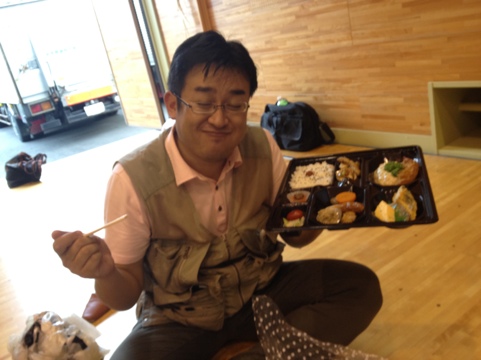 本番マエのひととき。お弁当をなんておいしそうに食べるんでしょう!岩手日報社・K介くん☆