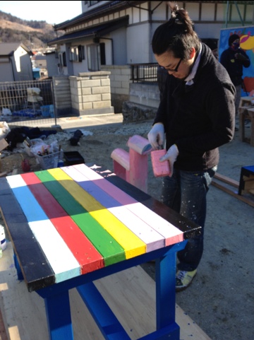 今回は、絵描き・中川さんが参加しておられました。仮設住宅の外観を素敵なイラストで彩っておられたり、こういった活動にも参加してくださったり、という仙台在住の方です。ペンキを塗るということ一つにもセンスというのが出るもので、最終的に各々みんな、作業の手を止めて、中川さんの筆づかいに見入るありさま(笑)。