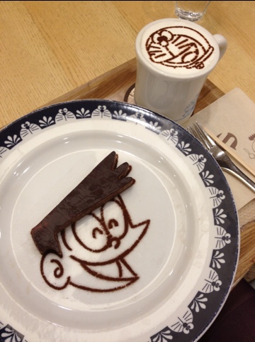 カフェはマストで行っていただきたい。この日も待ち時間2時間(!)でしたが、自分の順番が近づくとケータイにお知らせしてくれるサービスもあるので、その間ゆーっくり館内の観覧ができるので安心。ちなみにこちら「スネ夫のクレープ&カフェラテ」。他のメニューも制覇したい、ってくらいどれもこれも◎!