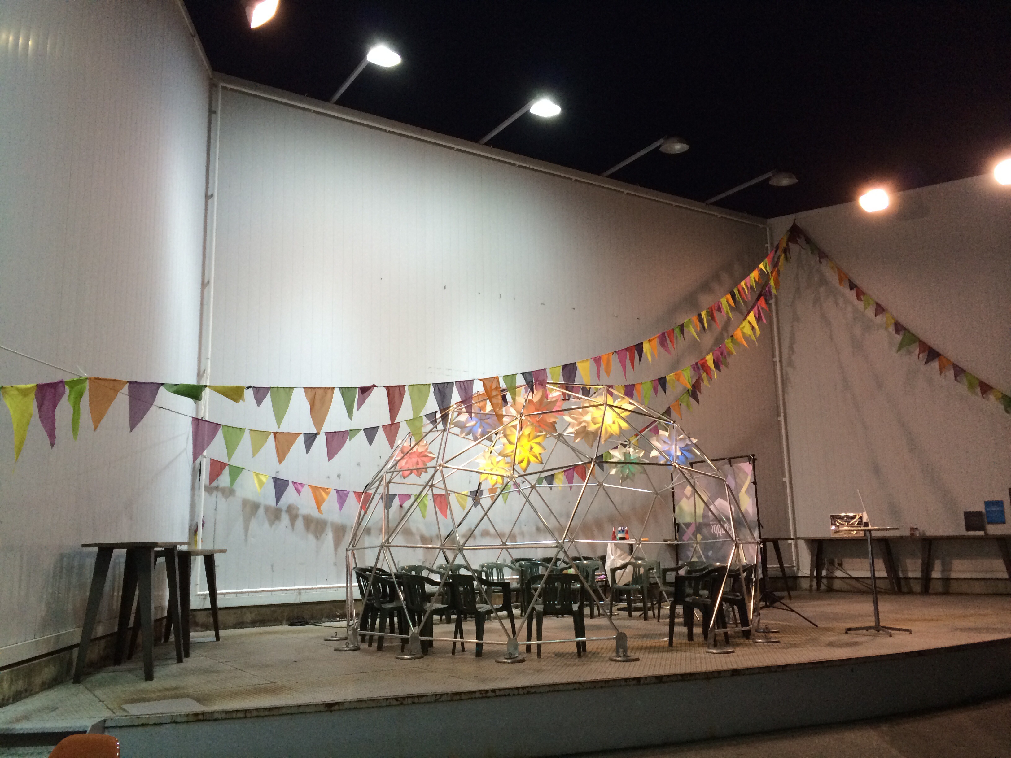 会場入り口のフリーエリア。自由に飲食したりできるスペースもこうしてシャレオツでございます。会場内部のバーカウンターのあたりもこんな雰囲気だったし、敷地内での他エリアのライブでもバーカウンターからUstream配信で見られるようにしていたり、なかなか勉強にもなったのでございますん☆