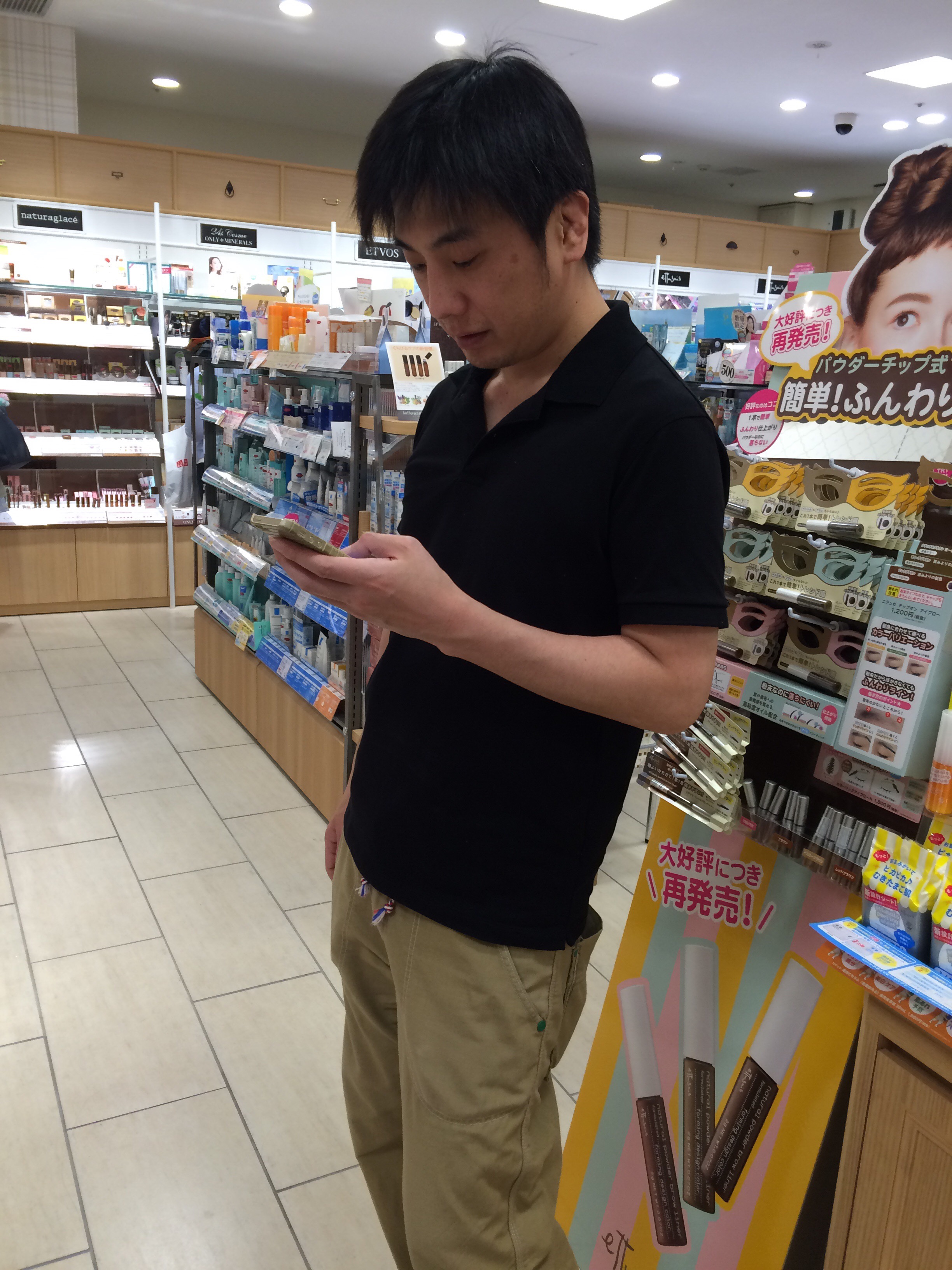 もらい事故につきあうモリタニアン。コスメ売り場でちえぞが欲しいモノを懸命にサーチしてくれるの図(ケセンロックで使うモノね!笑)♪