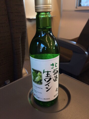 そろそろタイムアップ。小樽から千歳空港へ向かう車中。白ワイン・ナイアガラをラッパ飲みしつつ!